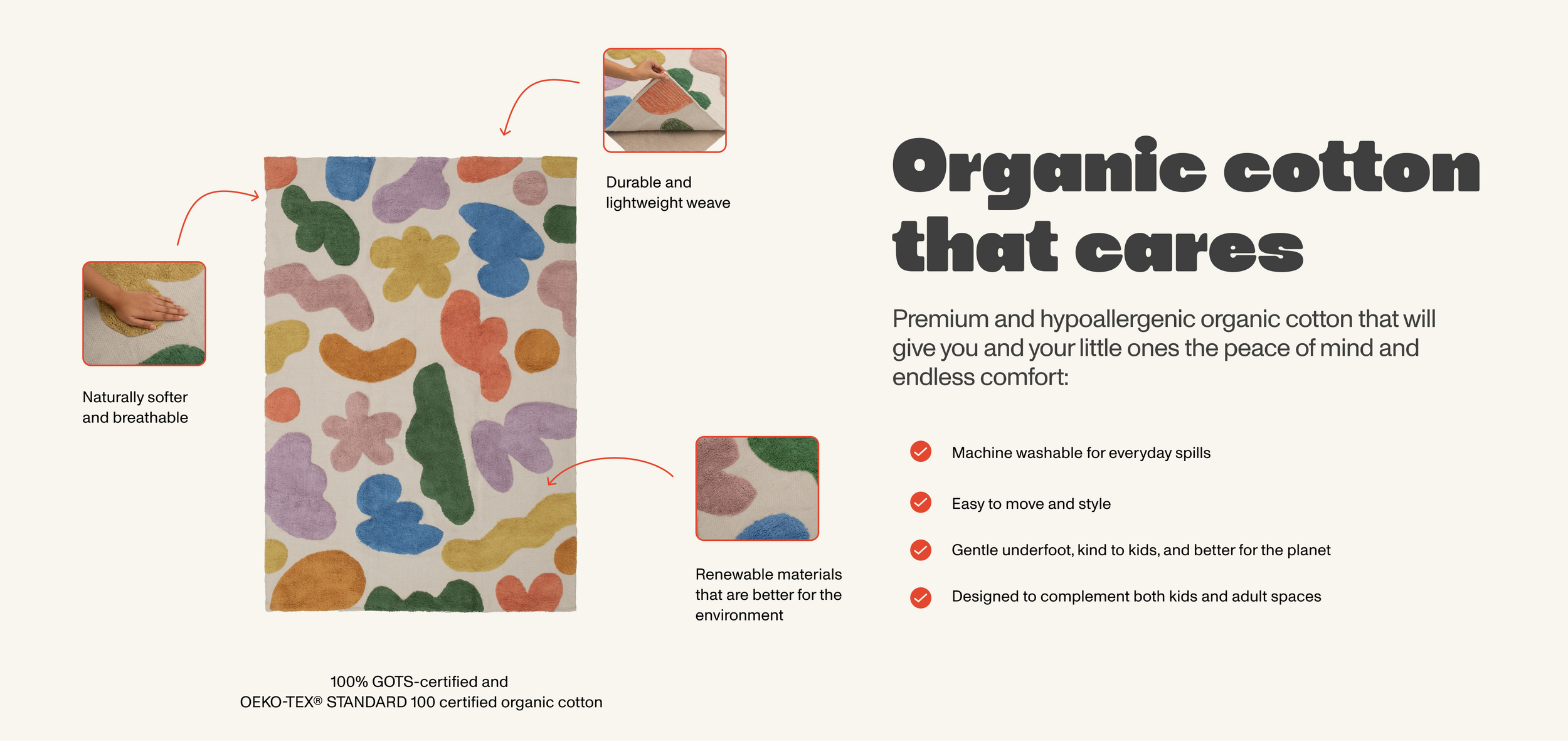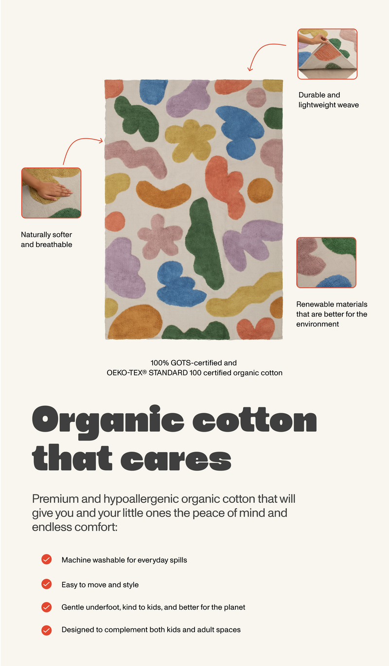 Absolutely. The Kids Organic Cotton rug is specifically designed for homes where real life happens—pets, children, and all the joyful mess that comes with them. The machine-washable construction means you can easily handle inevitable spills, accidents, and muddy paw prints without specialised cleaning methods or professional services. The organic cotton naturally resists staining better than many synthetic alternatives, while the OEKO-TEX® Standard 100 and GOTS certifications ensure the rug is completely safe for direct contact with children's sensitive skin and curious pets.