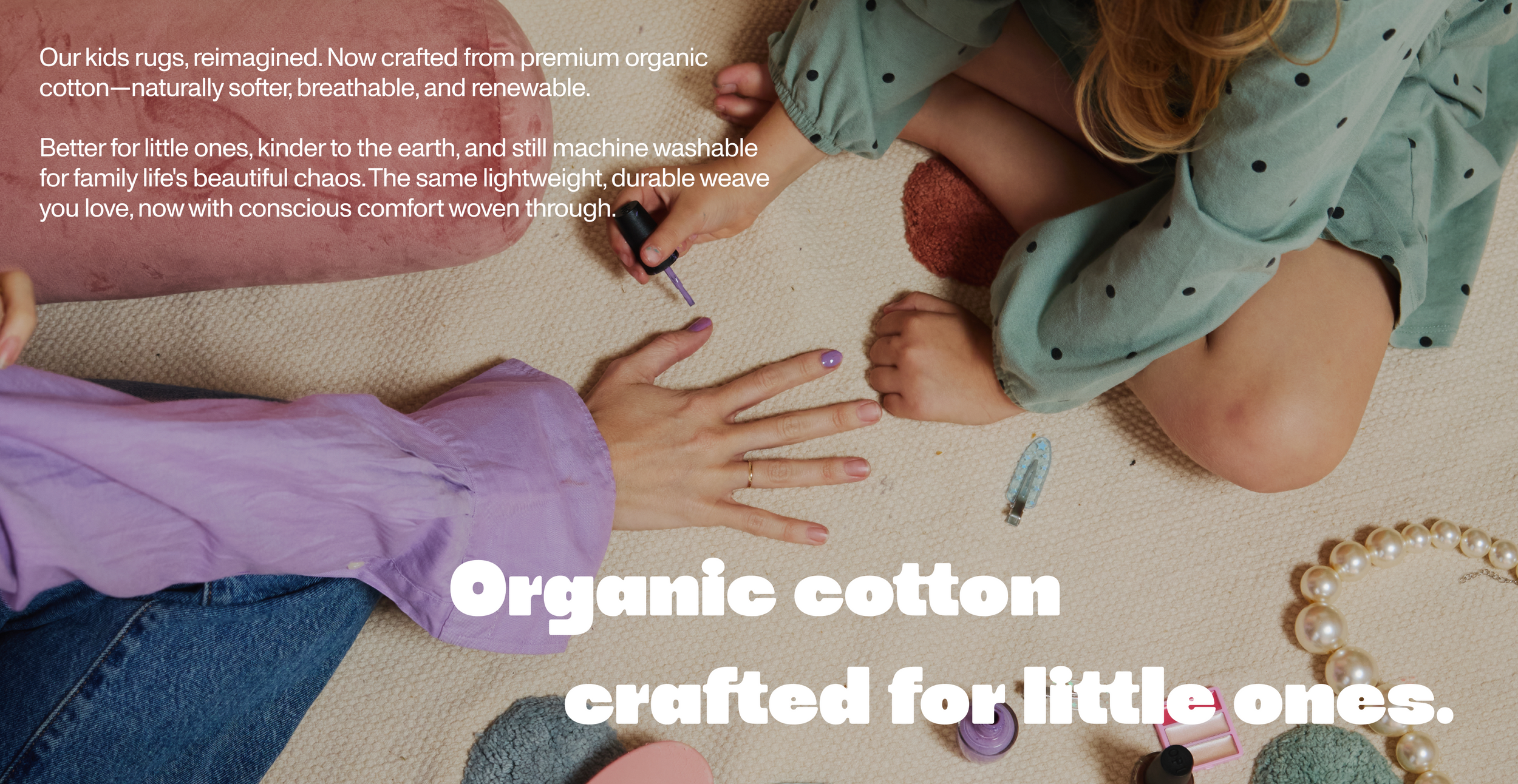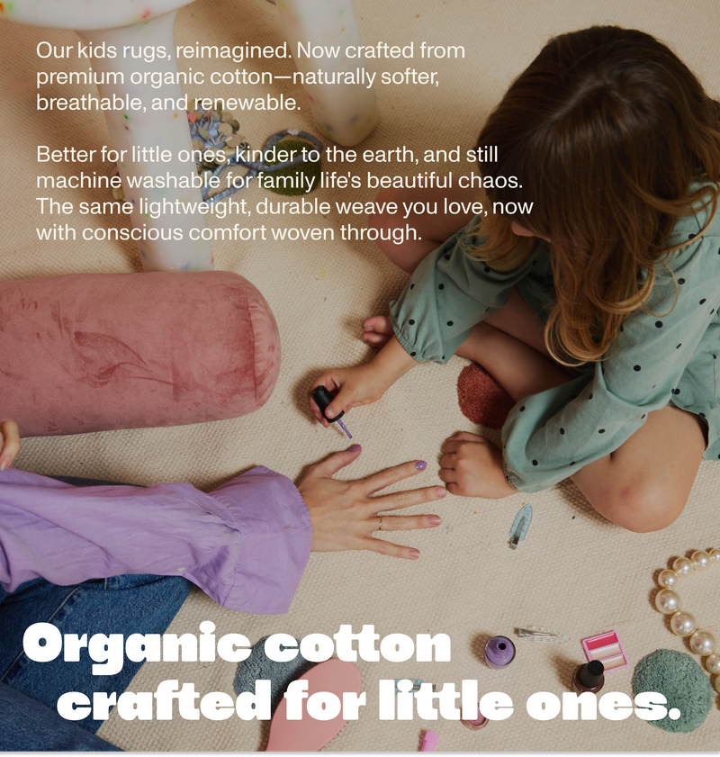 The Kids Organic Cotton Collection represents a considered reimagining of our original Kids Cotton Feel rugs—elevating every element from material to construction. Where our previous collection used recycled polyester, this new range is woven from 100% certified organic cotton—genuine natural fibres that are hypoallergenic, breathable, and gentle on delicate skin. The organic certification means these rugs are free from harsh chemicals, pesticides, and synthetic treatments—a significant advancement in safety for little ones. The refined 8mm cut pile offers a more premium hand feel while maintaining the lightweight nature that makes them incredibly easy to handle, move, and wash. From cotton feel to pure organic cotton—this is a meaningful step forward in quality and care.