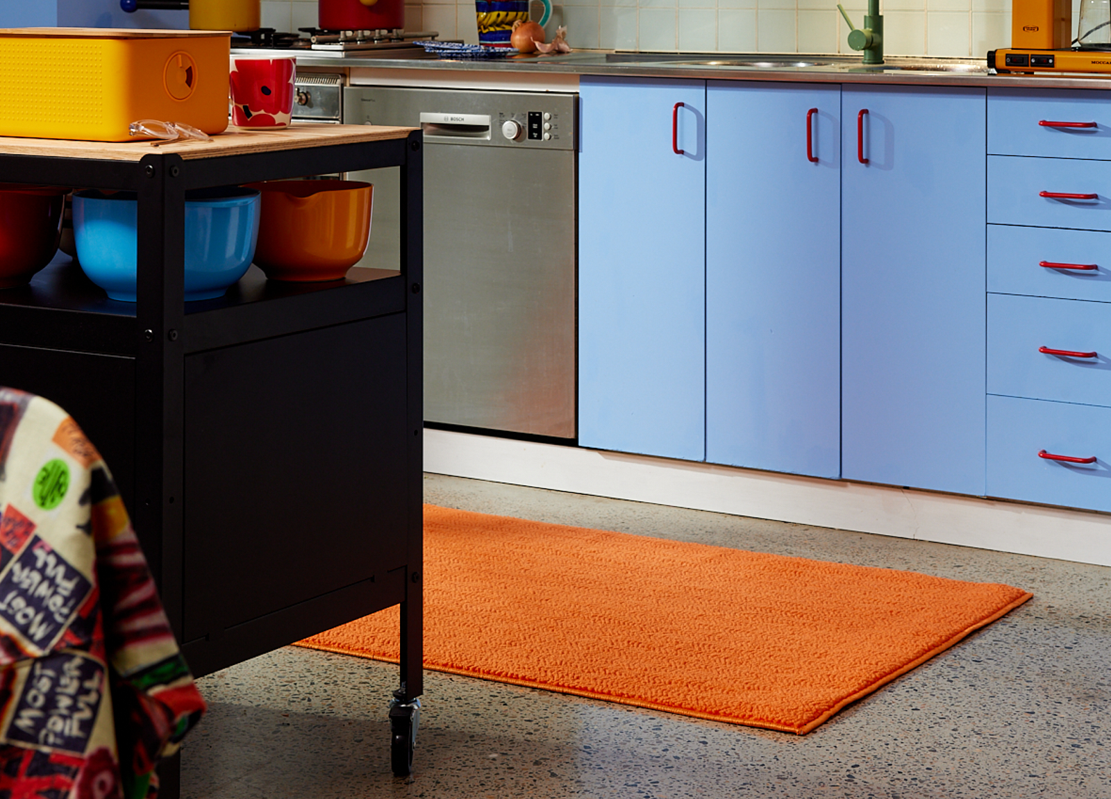 To avoid clutter in a small kitchen, choose a petite 60x90cm rug for the front area of the sink. The rug’s proportions are perfect for this type of setup.